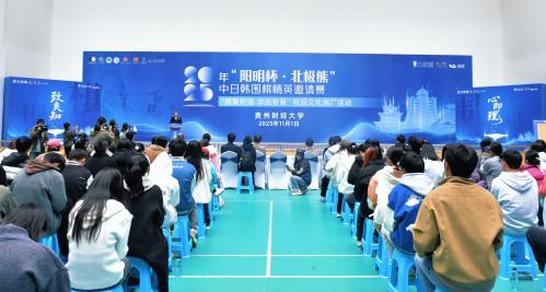 11月1日上午,2025年“阳明杯·北极熊”中日韩围棋精英邀请赛 “棋聚校园·弈启智慧”校园文化推广活动在我院举行。中国围棋协会名誉主席王汝南,中国围棋协会副秘书长、职业竞赛部部长刘菁,韩国国家围棋队教练崔哲瀚,韩国棋院次长尹广善,中日韩国籍围棋棋手代表参加活动,我校副校长徐艺,贵阳市体育局副局长黄俊,贵州广播电视台数字频道总监黄胜男,贵阳市体育局群体处处长余瑛,贵阳棋院(贵阳市棋牌管理中心)吴欣蔚,我院院长余兵、副院长龚卫华全程出席本次活动。本次活动由贵州广播电视台主持人齐道臻主持。