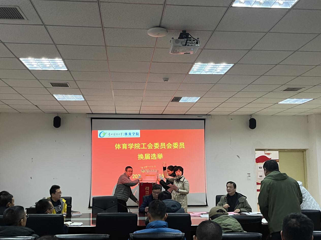 2025年12月17日下午1:30,体育学院召开全体教职工大会,顺利完成了新一届工会委员会的换届选举工作。院党委副书记吕骥主持并讲话,院长余兵,党委委员高国贤、向宇宏出席会议,各科室、系部(中心)负责人、支部书记参加会议。大会严格按照工会选举程序,以无记名投票、差额选举的方式,民主选举产生了新一届工会委员会主席及委员。